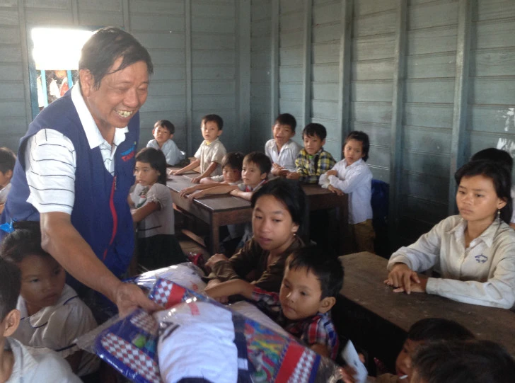 Đại diện Công ty Tanimex trao cho các em học sinh từ lớp 1 đến lớp 5 đang học tập Trung tâm Giáo dục và Từ thiện nuôi dạy trẻ em nghèo tại Biển Hồ.