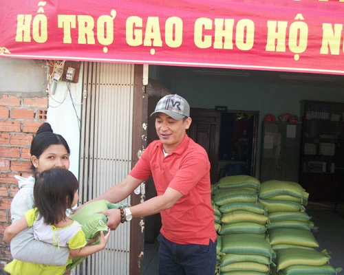 Ông Ngyễn Trọng Trí, Phó bí thư Khu phố 9, Bình Hưng Hòa B (áo đỏ) trao gạo, quà cho các hộ nghèo