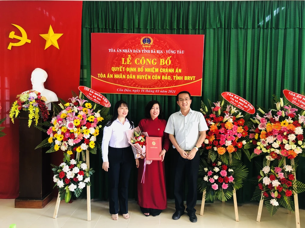 Chiều 16-3, tại huyện Côn Đảo, TAND tỉnh Bà Rịa- Vũng Tàu tổ chức lễ công bố và trao quyết định bổ nhiệm chức vụ Chánh án TAND huyện Côn Đảo đối với bà Trần Thị Mỹ Dung (phó chánh án TAND TP Bà Rịa).