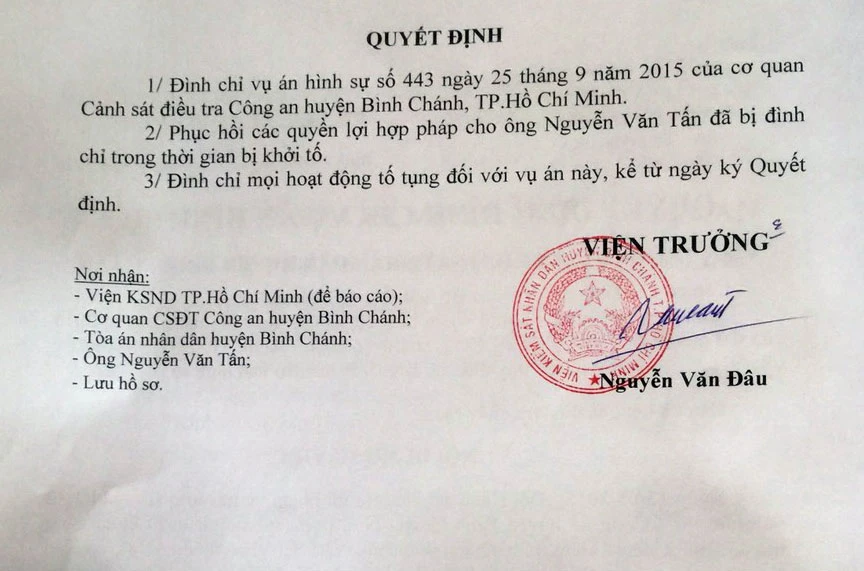 Hôm qua, Viện trưởng VKSND Tối cao Lê Minh Trí sau cuộc họp nghe VKSND TP.HCM và VKSND huyện Bình Chánh báo cáo quá trình giải quyết vụ án, đã chỉ đạo lập tức đình chỉ vụ án và minh định ông Tấn bị oan do hành vi không cấu thành tội phạm.