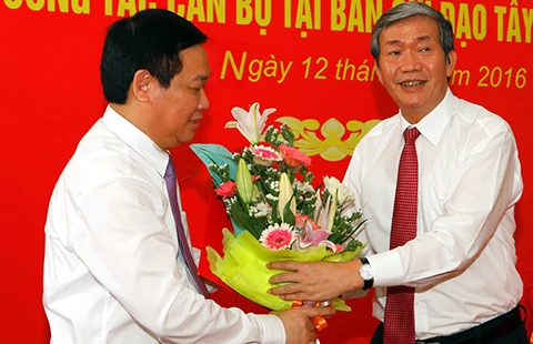 Ông Đinh Thế Huynh trao hoa chúc mừng Phó Thủ tướng Vương Đình Huệ(trái)kiêm chức trưởng Ban Chỉ đạo Tây Nam Bộ. Ảnh: GIA TUỆ