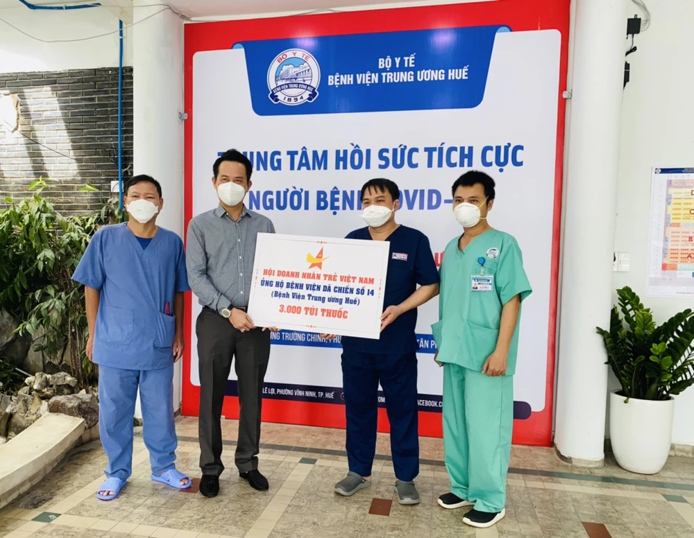 Ngày 11-9, Hội Doanh nhân trẻ Việt Nam đã trao tặng 3.000 túi thuốc cho Trung tâm hồi sức tích cực COVID-19 đặt tại BV dã chiến số 14 do BV Trung ương Huế phụ trách, giúp hỗ trợ công tác điều trị cho bệnh nhân F0.