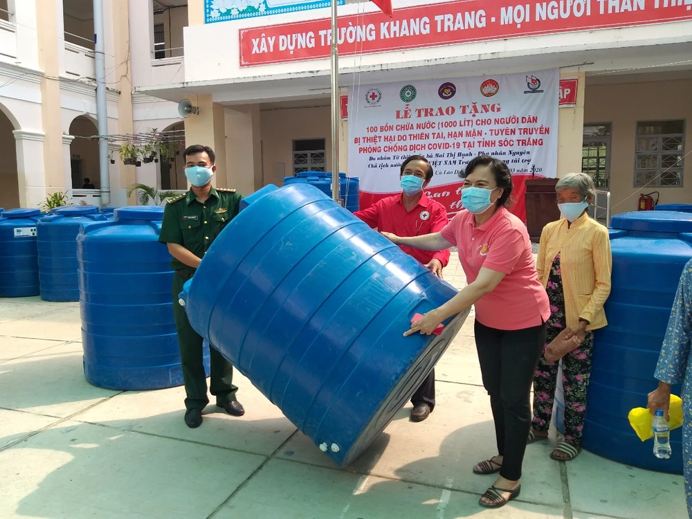 Đoàn đã trao 104 bồn chứa nước cho bà con nghèo trong vùng hạn mặn và bộ đội biên phòng Đồn Biên phòng An Thạnh Ba.