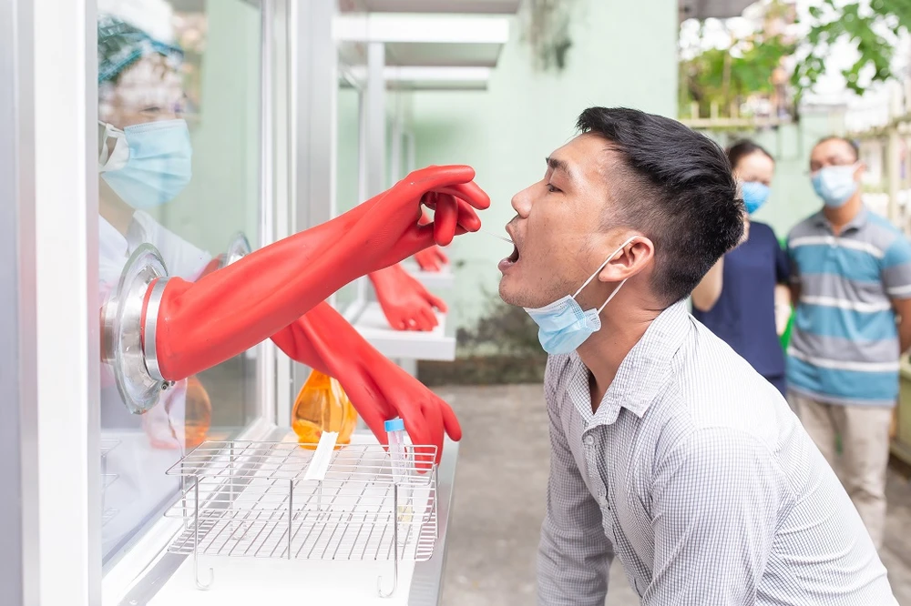 Các y bác sĩ tại Trung tâm Kiểm soát Bệnh tật Đà Nẵng sử dụng hệ thống phòng áp lực dương kháng khuẩn thực hiện lấy mẫu bệnh phẩm. ẢNH: SCG