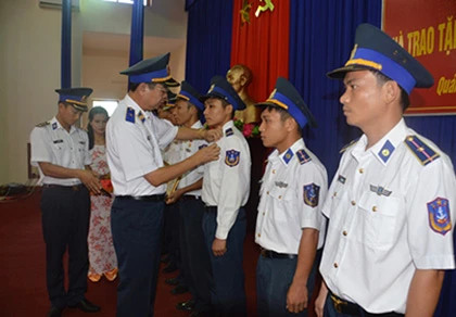 Trao huy hiệu “Tuổi trẻ dũng cảm” cho các chiến sĩ cảnh sát biển. Ảnh: CSB