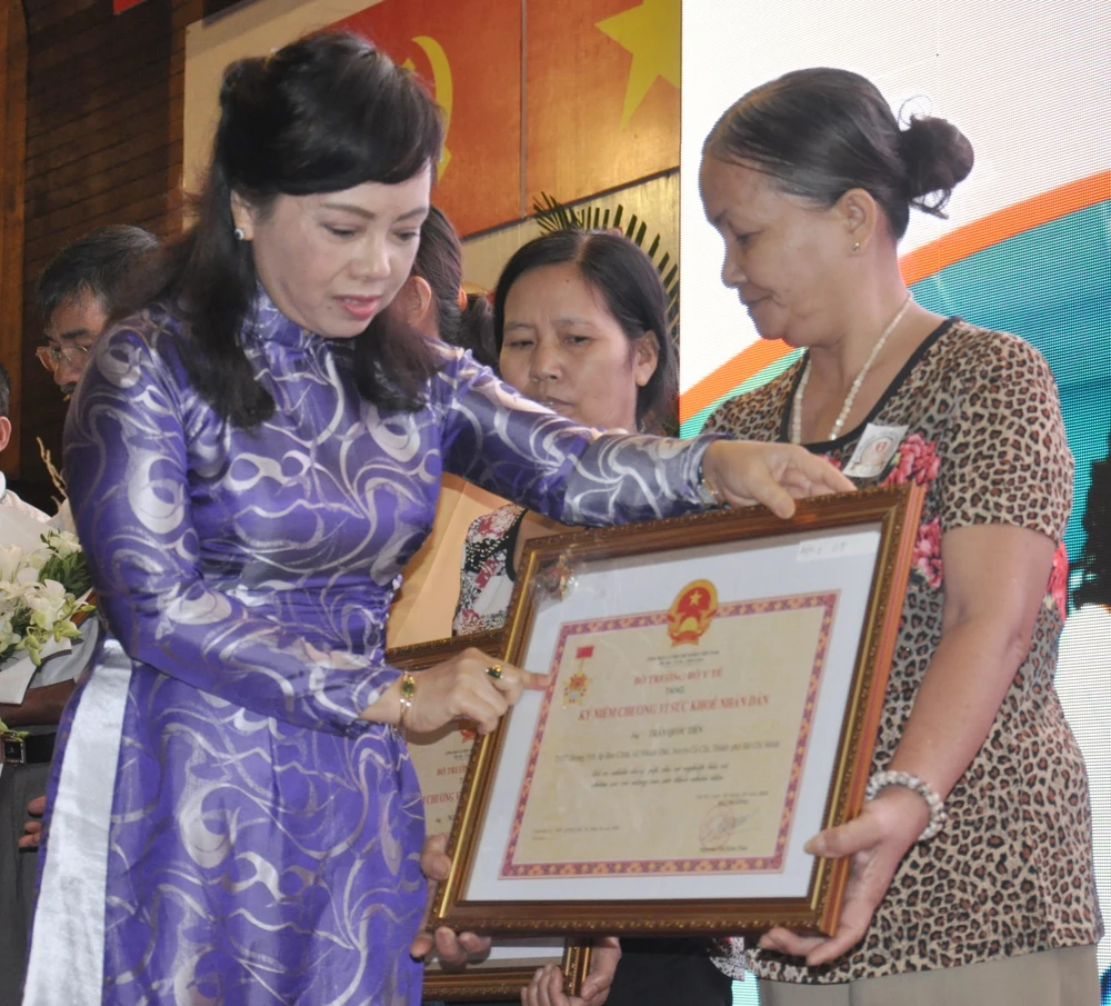 Bộ trưởng Bộ Y tế Nguyễn Thị Kim Tiến trao Kỷ niệm chương vì sức khỏe nhân dân cho người hiến tạng. Ảnh: DUY TÍNH