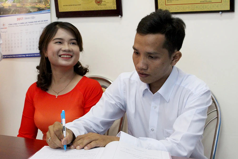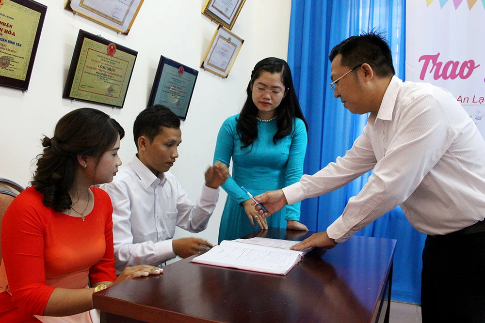 UBND phường An Lạc A đang hướng dẫn anh Hải - chị Ngọc Anh hoàn tất thủ tục kết hôn. Ảnh: L.THOA