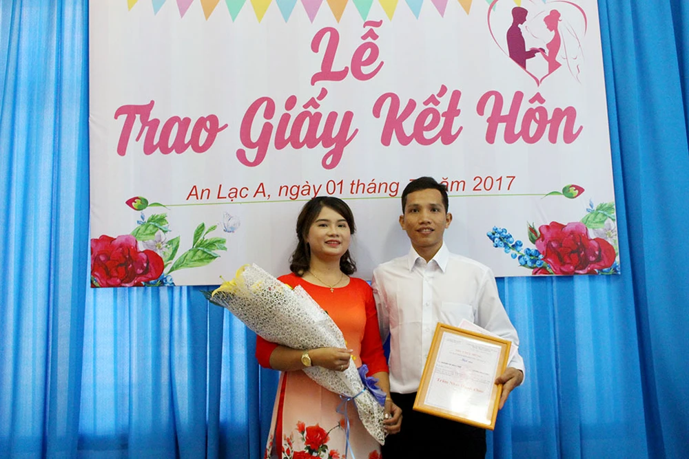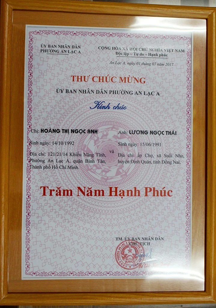 Đây là đôi bạn trẻ đầu tiên được UBND phường An Lạc A tổ chức một buổi trao giấy đăng ký kết hôn kèm một thư chúc mừng Trăm năm hạnh phúc. Tại đây, hai bạn Thái - Ngọc Anh được cán bộ phường hỗ trợ hoàn tất thủ tục và trao ngay “chứng nhận hôn nhân” trong không gian ấm áp.