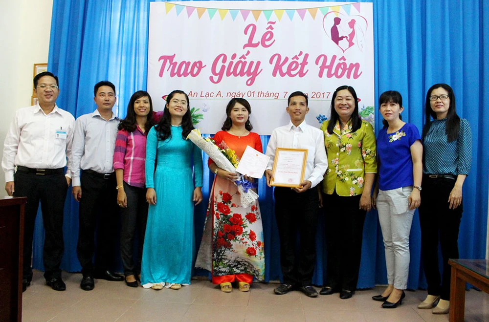 Bà Lê Thị Ngọc Dung, nữ Chủ tịch UBND phường An Lạc A, quận Bình Tân, TP.HCM, chúc mừng và không quên nhắc nhở cặp vợ chồng sắp cưới Lương Ngọc Thái (26 tuổi, ngụ Đồng Nai) và Hoàng Thị Ngọc Anh (25 tuổi, ngụ phường An Lạc A) như trên trong buổi trao giấy đăng ký kết hôn sáng 1-7.
