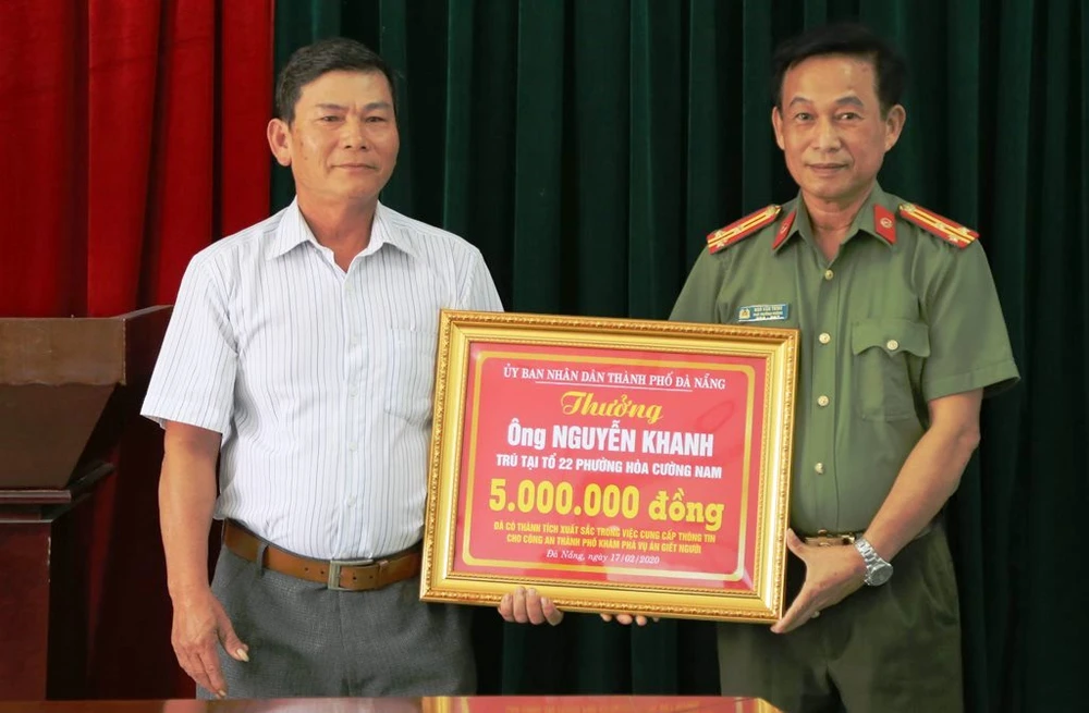 Ngày 17-2, Thượng tá Ngô Văn Trình, Phó Phòng Xây dựng phong trào, Công an TP Đà Nẵng, đã trao thưởng cho ông Nguyễn Khanh (55 tuổi, ngụ phường Hòa Cường Nam, quận Hải Châu).