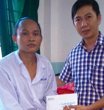 Phóng viên báo Pháp Luật TP.HCM trao tiền bạn đọc ủng hộ thi sĩ Đồng Chuông Tử. Ảnh: M.QUÝ