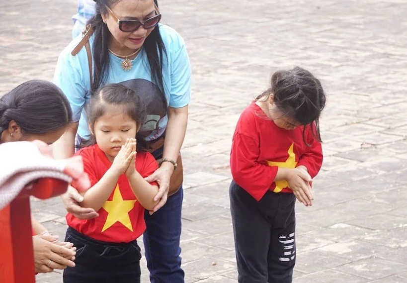 Một em nhỏ thành kính dân hương lên ba anh em nhà Tây Sơn.