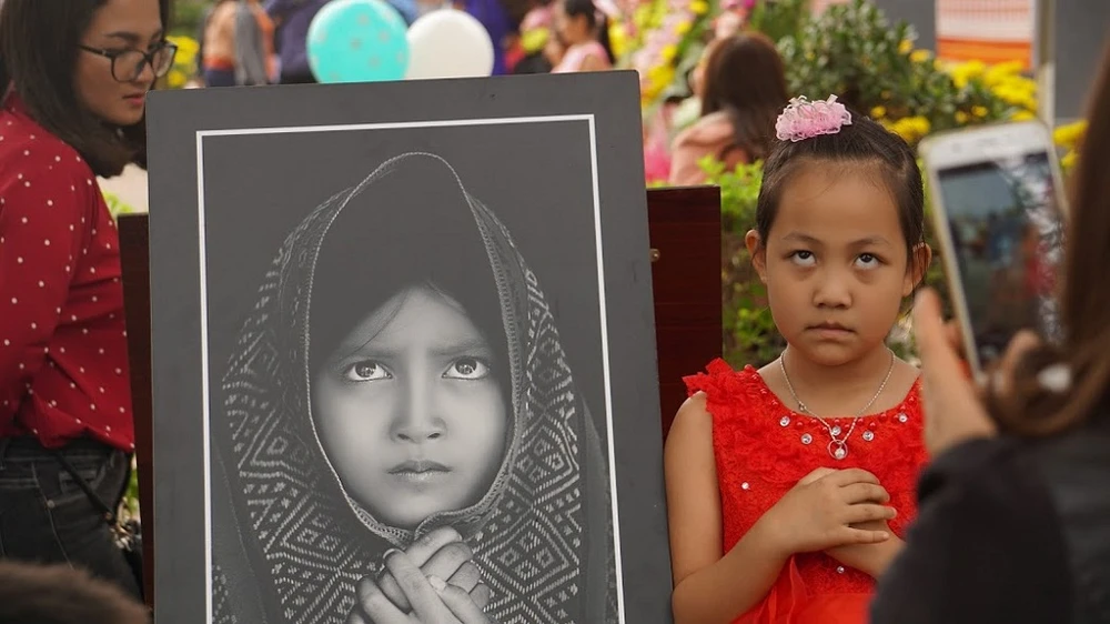 Một bé gái hài hước bắt chước biểu cảm của cô gái trong bức ảnh. ẢNH: CHÂN TÂM.