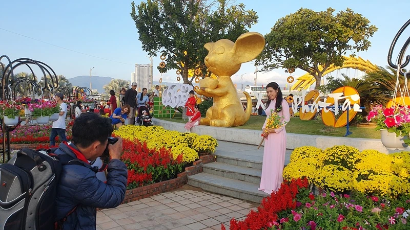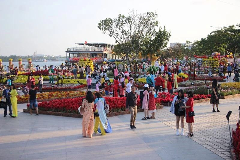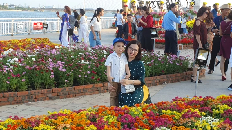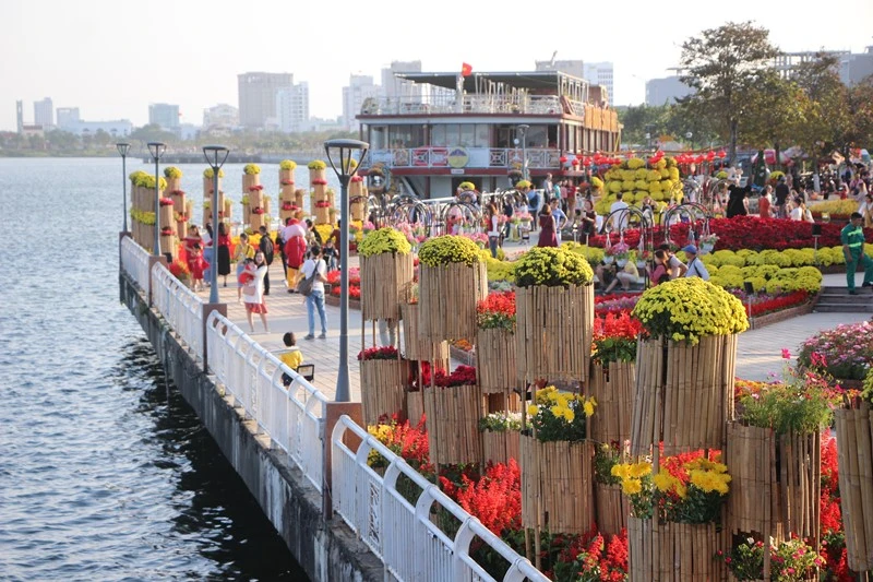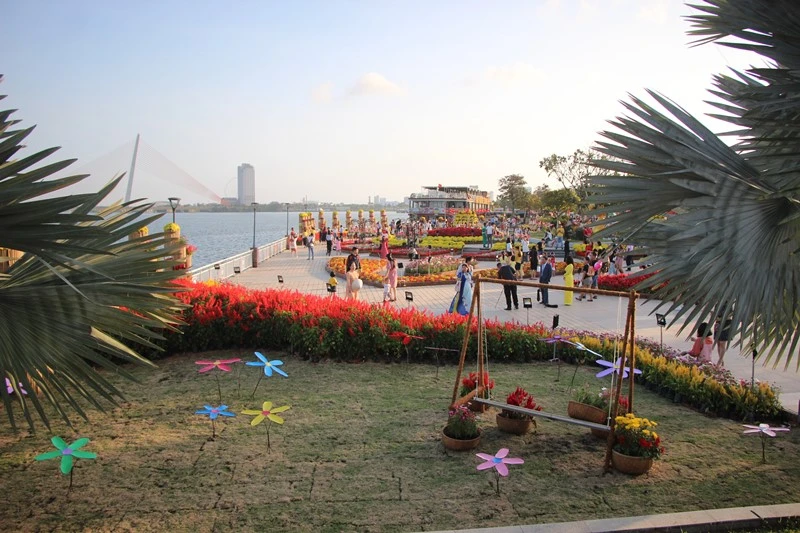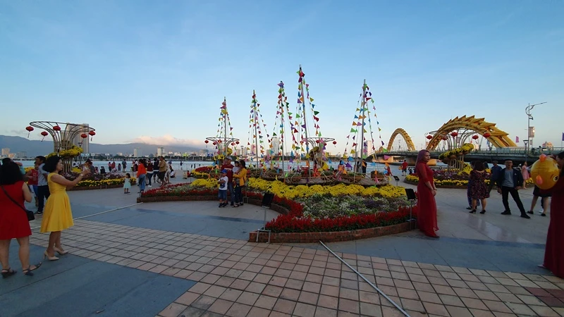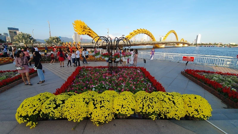 Đường hoa tết tại bờ tây cầu Rồng thu hút hàng ngàn lượt khách tham quan mỗi ngày. Ảnh: TẤN VIỆT