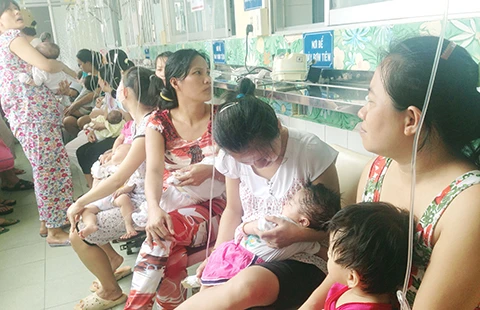 Thống kê tại các BV Nhi đồng 1, Nhi đồng 2, vào ngày thứ hai của tuần đầu tháng 8, khoa Hô hấp mỗi BV có trên 400 trẻ nhập viện điều trị. Trẻ nằm xếp lớp, 3-4 trẻ/giường. Hành lang, cầu thang BV không còn chỗ chen chân.