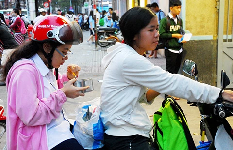 Một học sinh ăn vội phần cơm trên xe để tiếp tục vào học thêm trước cổng trường ở TP.HCM. Ảnh: HTD