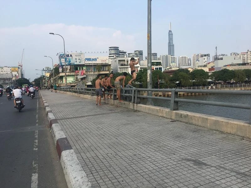 Theo ghi nhận của phóng viên PLO, chiều ngày 9-4, tại cầu Thị Nghè, phường 19, quận Bình Thạnh có một nhóm trẻ em và thanh niên khoảng 8 người tụ tập trên cầu. Nhóm người này tụ tập thành tốp, sau đó lần lượt nhảy từ trên cầu xuống lòng kênh tắm (ảnh).