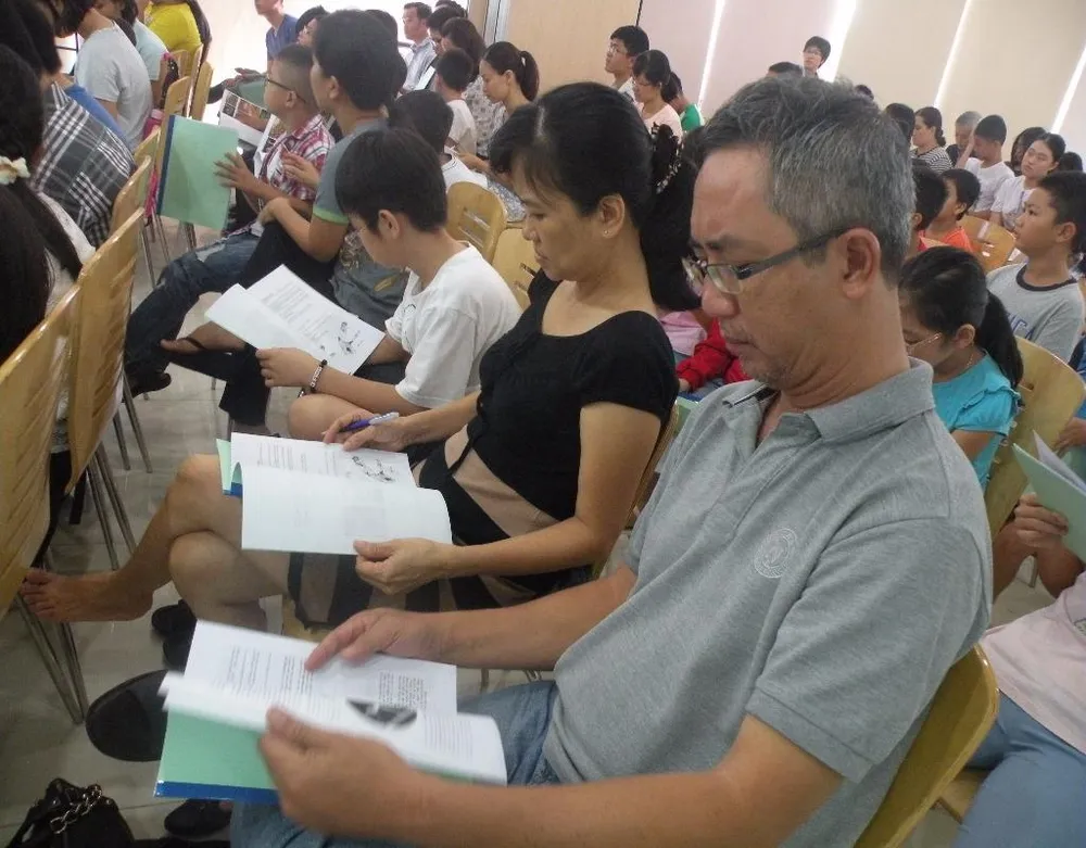 Tài liệu của buổi học đều được các bậc cha mẹ và các bé xem rất kỹ. Ảnh: NGUYỄN QUYÊN.