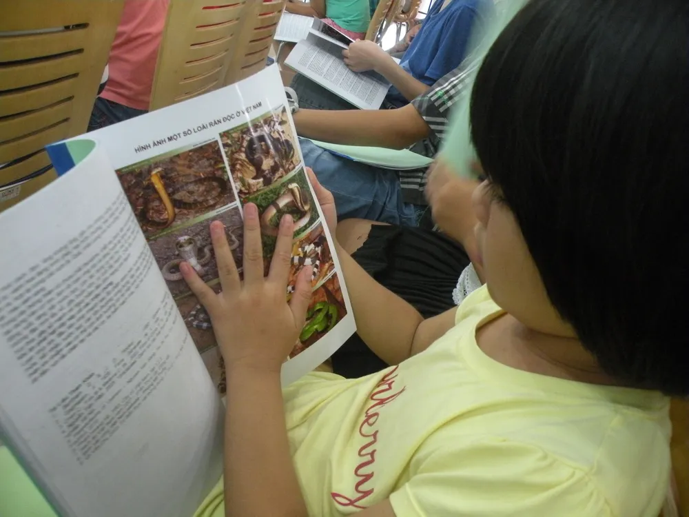 Tại buổi chia sẻ, khoảng 100 em nhỏ đã được chuyên gia nghiên cứu sinh vật rừng Phùng Mỹ Trung chuyển tải những kiến thức thú vị về phân biệt các lòai rắn độc và cây cỏ độc thông qua tài liệu và vật mẫu thật.