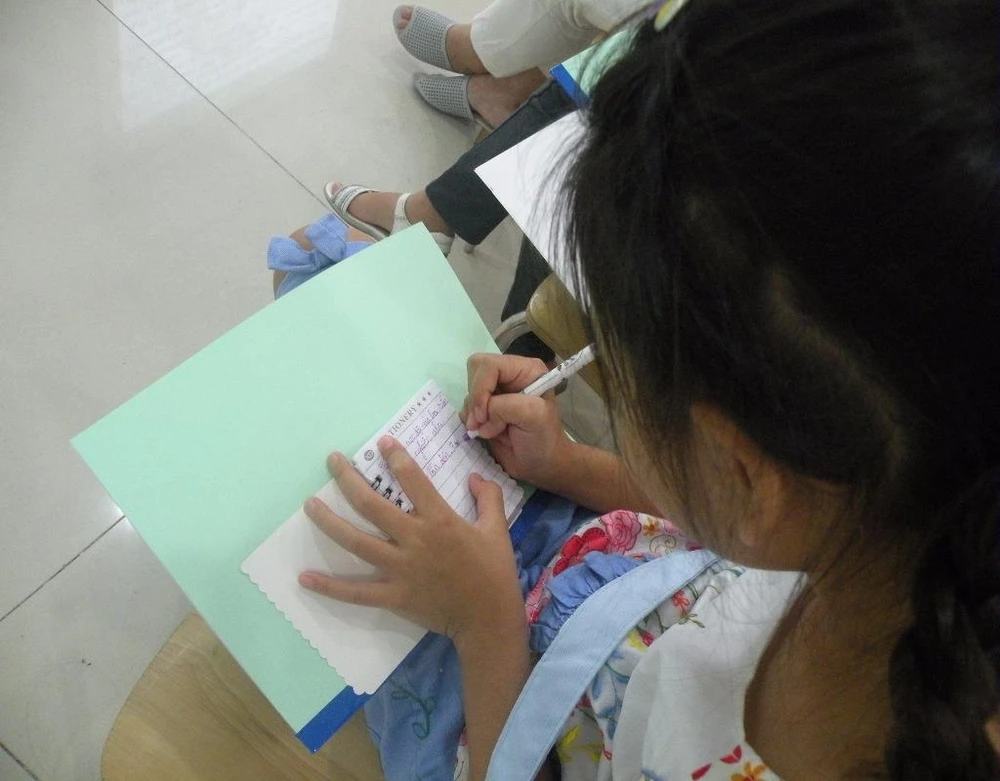 Bé Ngô Thanh Giang, học lớp 2, trường Trịnh Hoài Đức ghi chép lại cẩn thận những nội dung mà bé thấy thích. Ảnh: NGUYỄN QUYÊN.