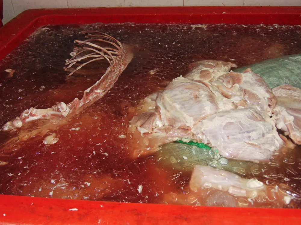 Thịt và xương được ngâm trong nước đỏ au, bốc mùi khó chịu. Ảnh: TRẦN NGỌC