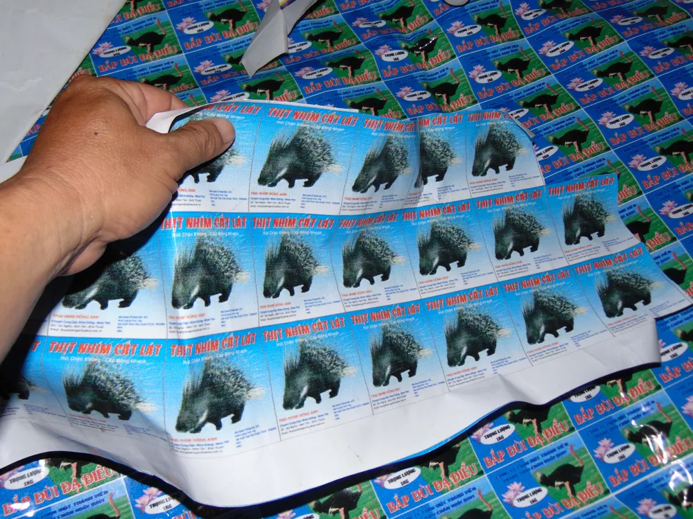 Nhiều nhãn in hình con nhím và đà điểu. Ảnh: TRẦN NGỌC