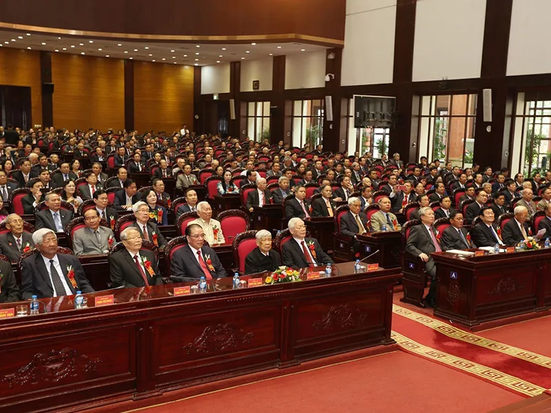 Tổng Bí thư Nguyễn Phú Trọng cùng nhiều lãnh đạo, nguyên lãnh đạo cấp cao của Đảng, Nhà nước dự lễ kỷ niệm 70 năm ngày truyền thống ngành kiểm tra Đảng được tổ chức tại Hà Nội ngày 12-10. Ảnh: TTXVN