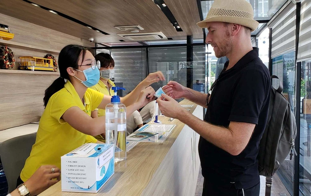 Du khách nước ngoài đến bến cảng được hướng dẫn và phát khẩu trang miễn phí. Ảnh: TỰ SANG
