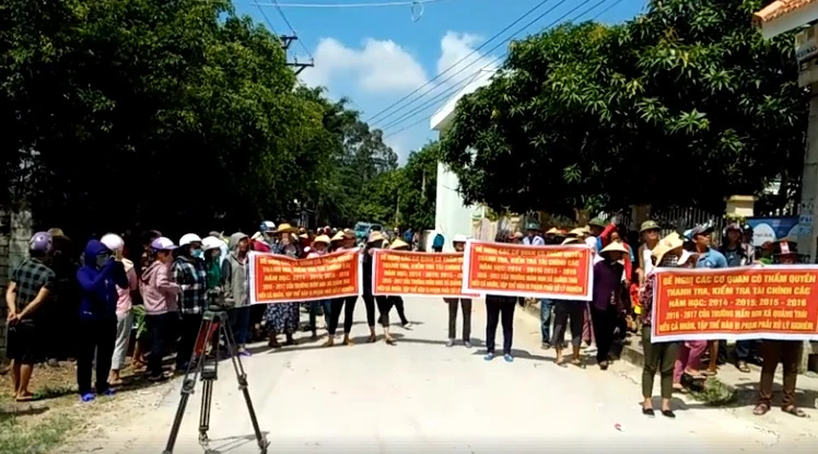 Người dân treo băng rôn đề nghị cơ quan chức năng có thẩm quyền thanh tra, kiểm tra tài chính các năm học 2014-2015, 2015-2016 và 2016-2017 nếu cá nhân tập thể có vi phạm phải xử lý nghiêm theo quy định của pháp luật.