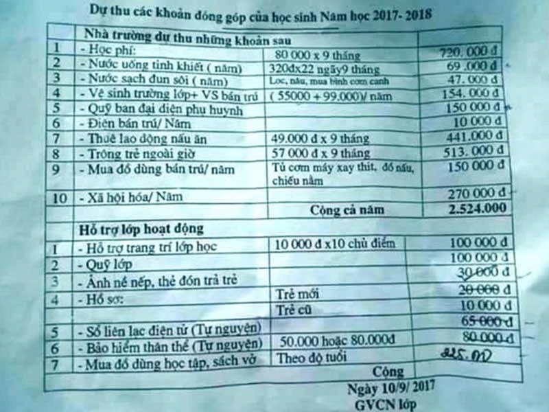 Ngoài những khoản thu trên còn một số khoản thu khác như hỗ trợ trang trí lớp học 100.000 đồng, quỹ lớp 100.000 đồng, ảnh nề nếp, thẻ đón trả trẻ 30.000 đồng, sổ liên lạc điện tử 65.000 đồng, mua đồ dùng học tập, sách vở 225.000 đồng.