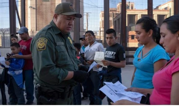 Một nhân viên Hải quan Mỹ kiểm tra giấy tờ của một nhóm người di cư từ Mexico tới ở TP El Paso (bang Texas). Ảnh: AFP