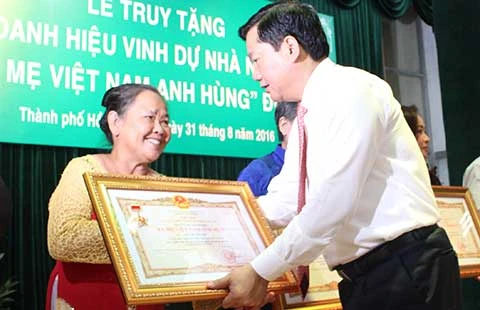Bí thư Đinh La Thăng trao danh hiệu Mẹ Việt Nam anh hùng cho thân nhân của các mẹ. Ảnh: THANH TUYỀN