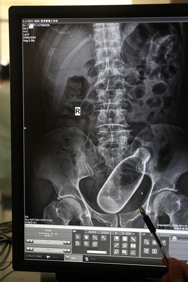 Ảnh chụp X-quang bụng chậu của một người đàn ông 60 tuổi đến từ Chu Hải, tỉnh Quảng Đông (Trung Quốc), cho thấy một chai nước đã được nhét vào bên trong hậu môn của ông.