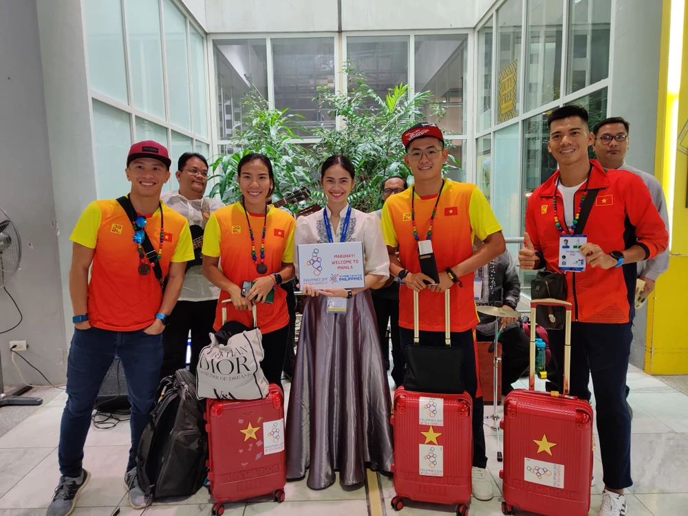 Sáng nay, đội tuyển ba môn phối hợp lên đường về nước nhưng bị kẹt lại ở sân bay quốc tế Manila do ảnh hưởng của siêu bão Kammury. Ảnh: MQ