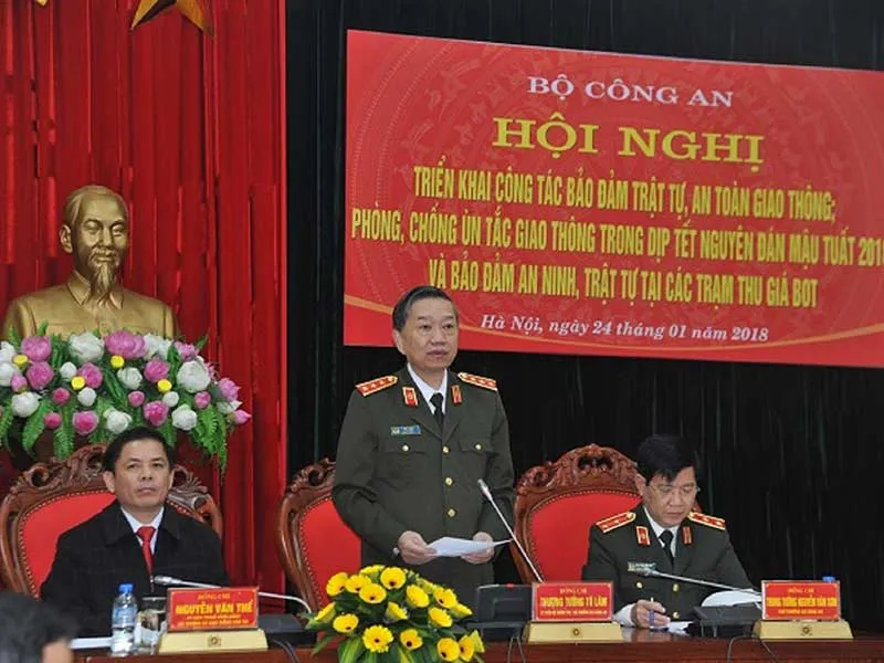 Ngày 24-1, Bộ Công an tổ chức hội nghị trực tuyến triển khai công tác đảm bảo trật tự an toàn giao thông (ATGT), phòng chống ùn tắc giao thông trong dịp Tết nguyên đán Mậu Tuất 2018 và đảm bảo an ninh trật tự tại các trạm thu phí BOT. Hội nghị do Thượng tướng Tô Lâm, Bộ trưởng Bộ Công an và Bộ trưởng Bộ GTVT Nguyễn Văn Thể chủ trì.