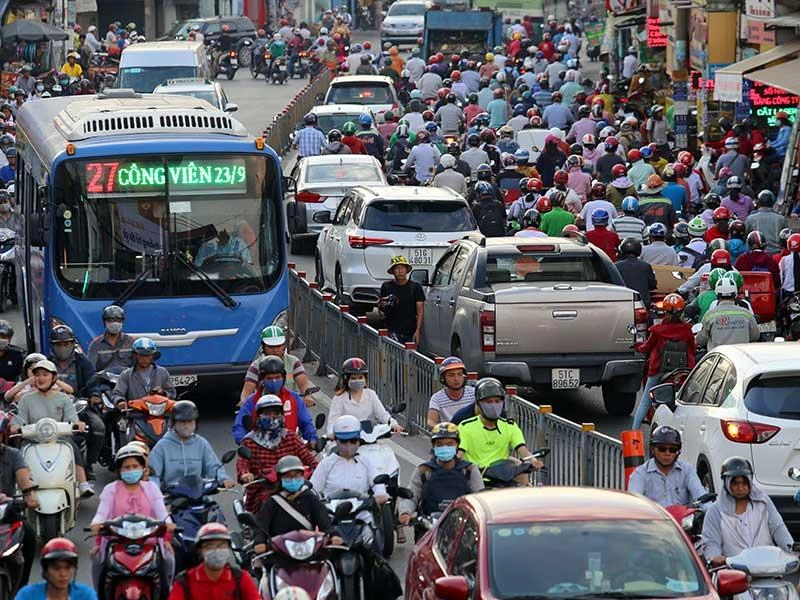 Lượng xe máy, ô tô, xe tải rất đông cùng với xe buýt ra vào đón khách gây tắc nghẽn giao thông nghiêm trọng. Đến khoảng 18 giờ, nhiều người và phương tiện qua đây phải chen lấn, len lỏi từng chút một. Dù được lực lượng thanh niên xung phong và CSGT tích cực phân luồng nhưng tình hình kẹt xe vẫn không cải thiện.
