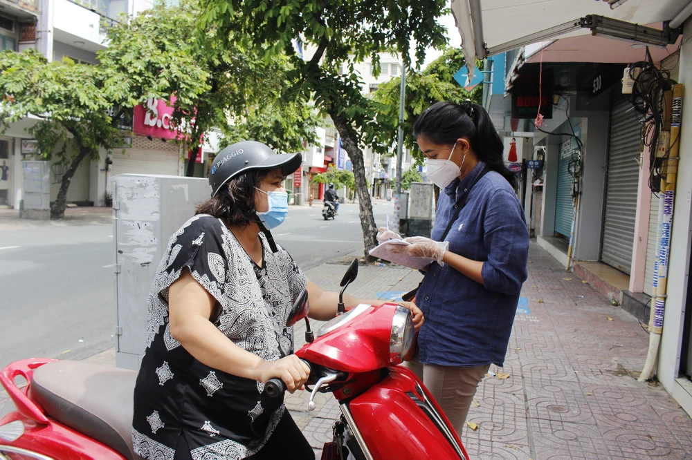 Kiểm tra giấy tờ, giấy "thông hành" của một người giao hàng. Ảnh: NGUYỄN YÊN