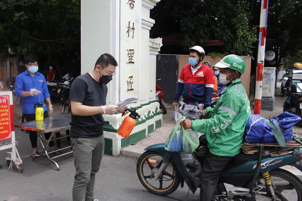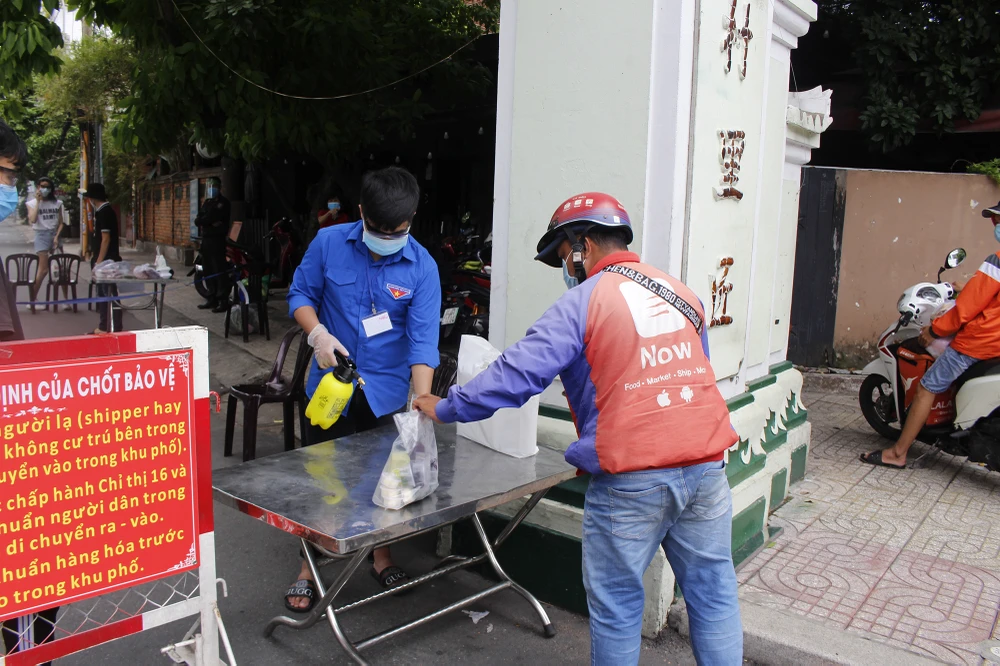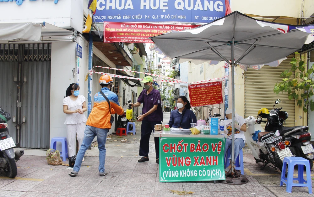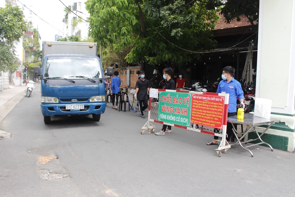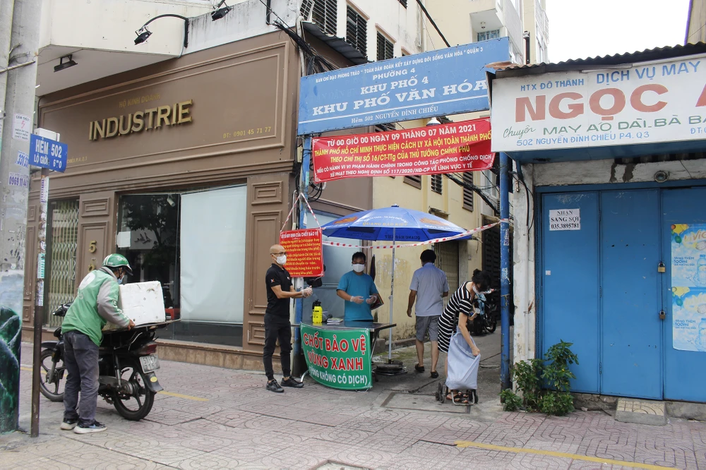 Theo ghi nhận, tại các hẻm 502 và 544 Nguyễn Đình Chiểu và cổng vào khu Cư Xá Đô Thành, lực lượng chức năng phường 4, quận 3 đã triển khai “Chốt bảo vệ vùng xanh - vùng không có dịch”. Các chốt này ngăn không cho shipper vào khu vực bên trong và có triển khai nhiều tình nguyện viên túc trực canh gác, hỗ trợ người dân nhận giao hàng hoá và khử trùng.