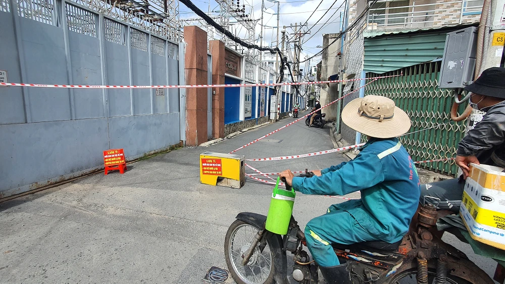 Khu vực hạn chế người lạ, shipper giao hàng bên ngoài ở một con hẻm thuộc phường 5, quận Phú Nhuận. Ảnh: NGUYỄN YÊN