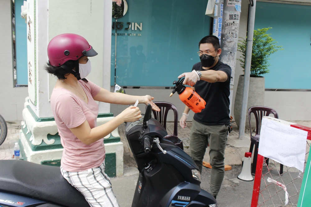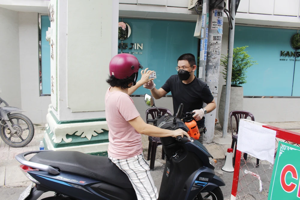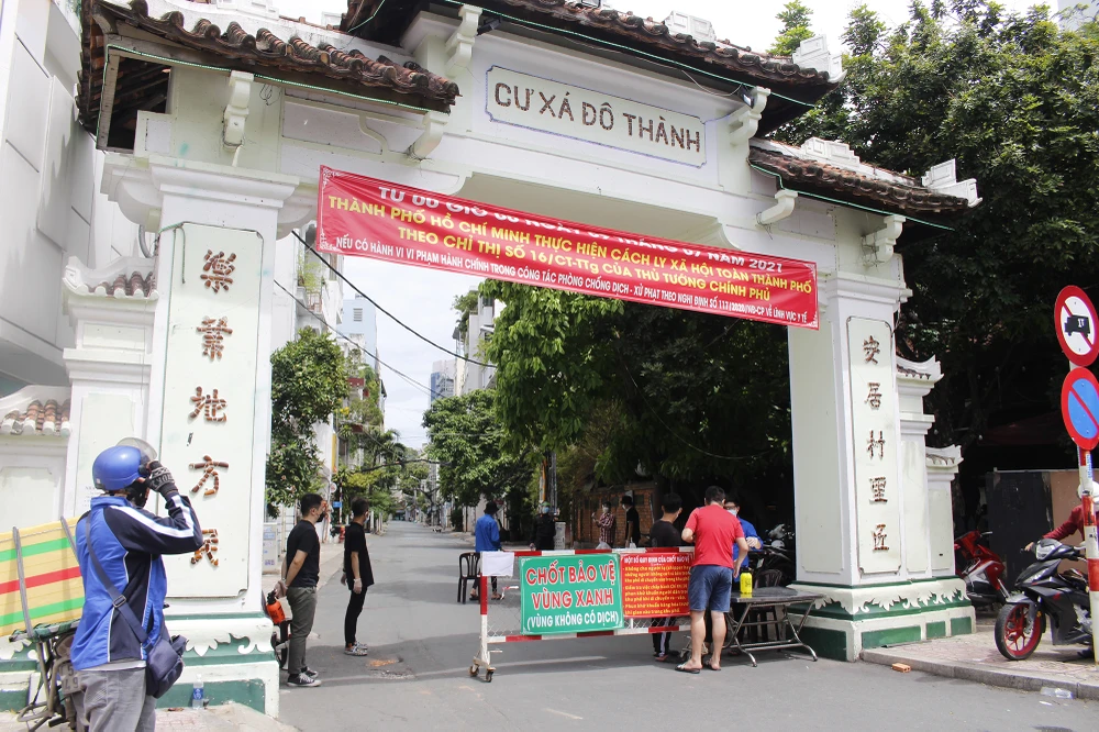 Tại “chốt bảo vệ vùng xanh” ở cổng vào khu Cư Xá Đô Thành (trên đường Điện Biên Phủ), rào chắn được thiết lập với dòng thông báo không cho người lạ di chuyển vào trong, kể cả shipper. Lực lượng tại chốt sẽ phun khử khuẩn người dân ra vào chốt, khử khuẩn hàng hoá trước khi giao vào bên trong.