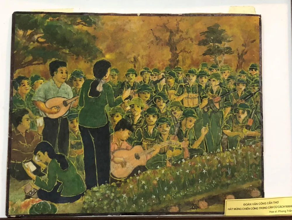 Bức ký họa đoàn văn công Cần Thơ hát mừng chiến công tại căn cứ.
