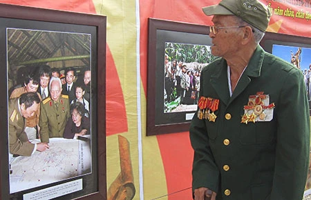 Cựu chiến binh xúc động khi xem những hoạt động của Đại tướng Võ Nguyên Giáp qua ảnh. Ảnh: VIẾT LONG