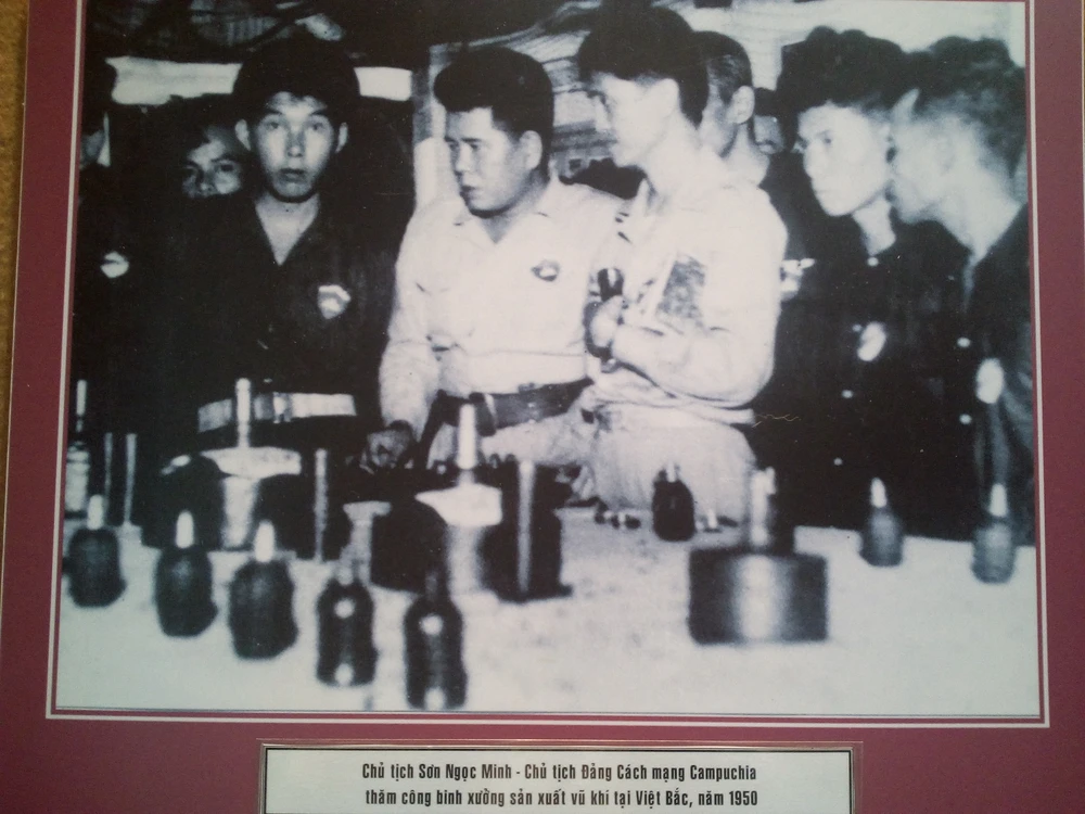 Hình ảnh ông Sơn Ngọc Minh - Chủ tịch Đảng Cách mạng Campuchia thăm công binh xưởng sản xuất vũ khí tại Việt Bắc năm 1950