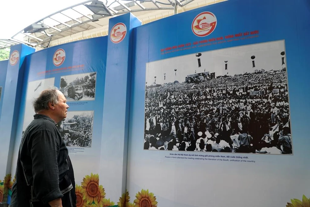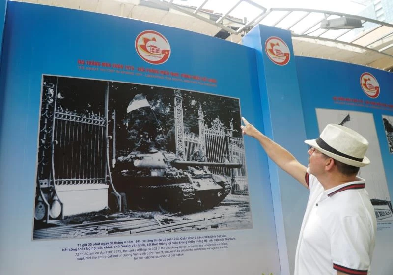 Một du khách nước ngoài đang xem hình ảnh lịch sử được chụp lại vào lúc 11 giờ 30 phút ngày 30-04-1975, xe tăng thuộc Lữ đoàn 203, Quân đoàn 2, húc đổ cổng chính của Dinh Độc Lập.