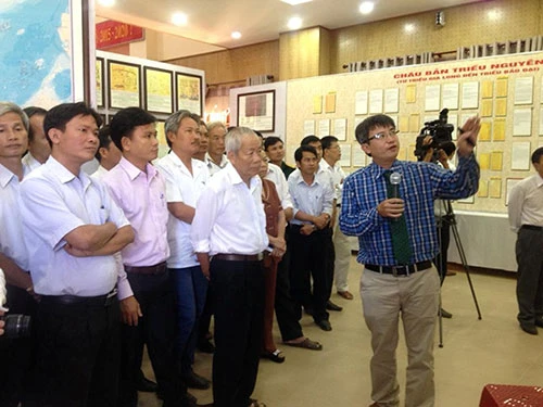 Người dân nghe thuyết trình trong triển lãm về Hoàng Sa-Trường Sa được tổ chức tại huyện miền núi Tiên Phước (Quảng Nam).