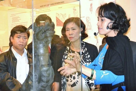 Khách tham quan thích thú khám phá hình tượng nghê, sư tử trong văn hóa Việt Nam. Ảnh: Baodientu.plo.vn