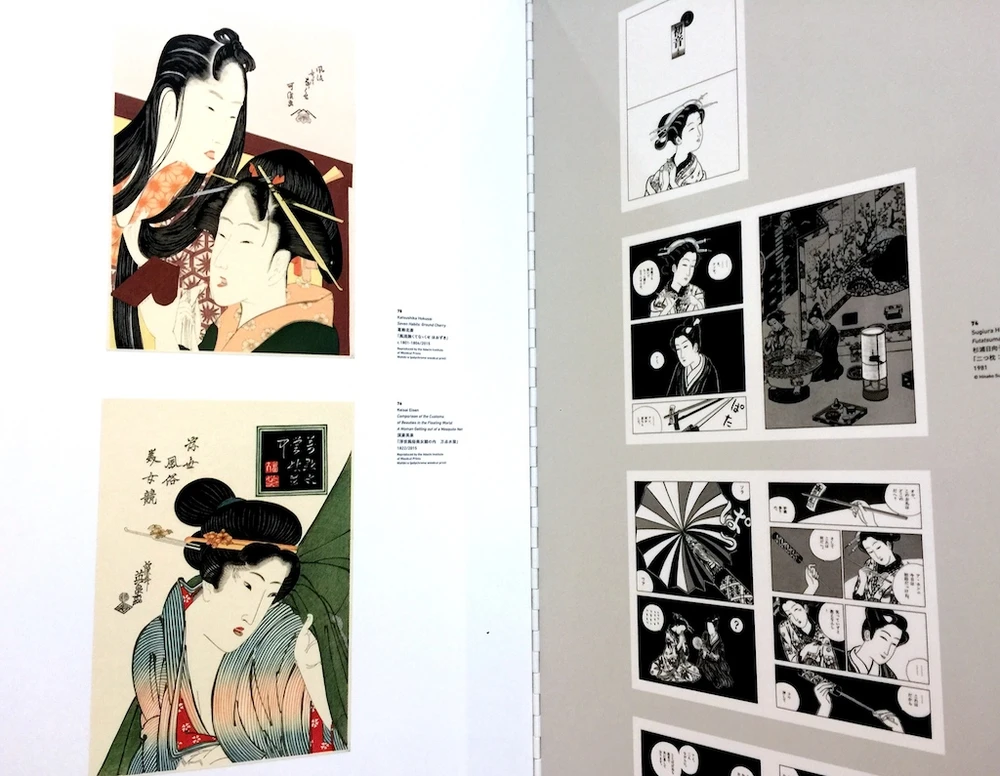 Tác phẩm Sáu người đẹp nổi tiếng: Kỹ nữ Hanaogi của nhà Ogiya (dưới dùng bên trái) của hoạ sĩ Kitagawa Utamaro (1753-1806). Đây được xem là điển hình của nghệ thuật vẽ tranh về các mỹ nữ. Utamaro được đánh giá là người tạo ra vẻ đẹp nữ tính hoàn toàn mới cho các nhân vật nữ trong manga, đó là sự phân biệt bản thân bằng chủ nghĩa nhục dục lý tưởng và chủ nghĩa hiện thực tinh tế.