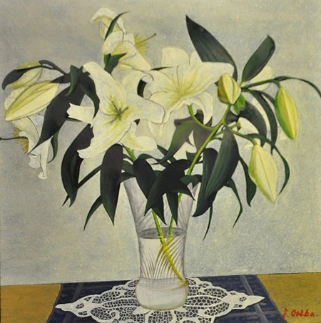 Bức tranh tĩnh vật hoa ly được vẽ theo phong cách tranh sơn mài Việt Nam. Ảnh: TRÀ GIANG