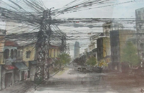 Một bức tranh thủy mặc tại triển lãm “Tiếp nối” vẽ phong cảnh theo tinh thần tranh thủy mặc truyền thống nhưng không vẽ cảnh sơn thủy mà lại mang nét hiện đại hơn khi tái hiện phố xá hôm nay. Ảnh: HÒA BÌNH
