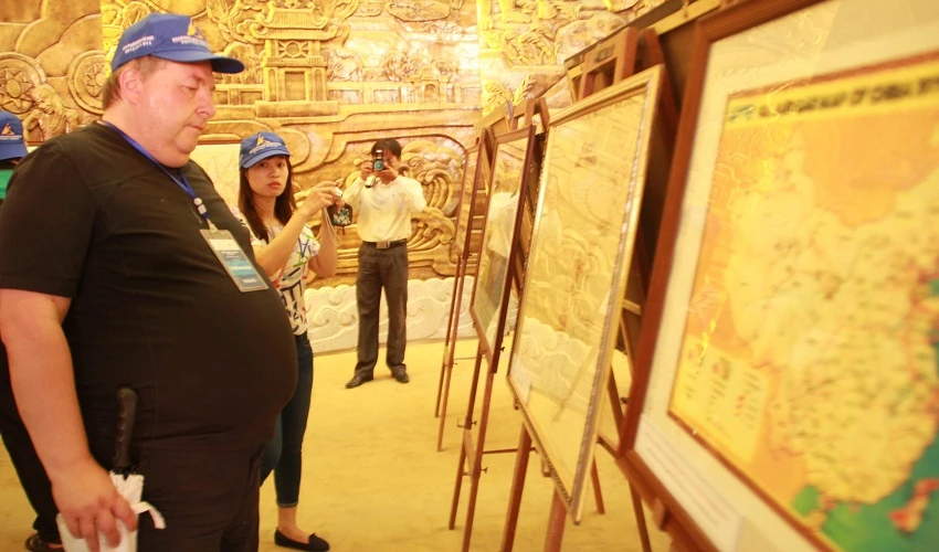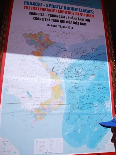 Các học giả và nhà nghiên cứu quốc tế đã ký vào tấm bản đồ Việt Nam, trên đó có hai quần đảo Hoàng Sa-Trường Sa thuộc chủ quyền Việt Nam khổ lớn được dựng trước Bảo tàng Đà Nẵng.